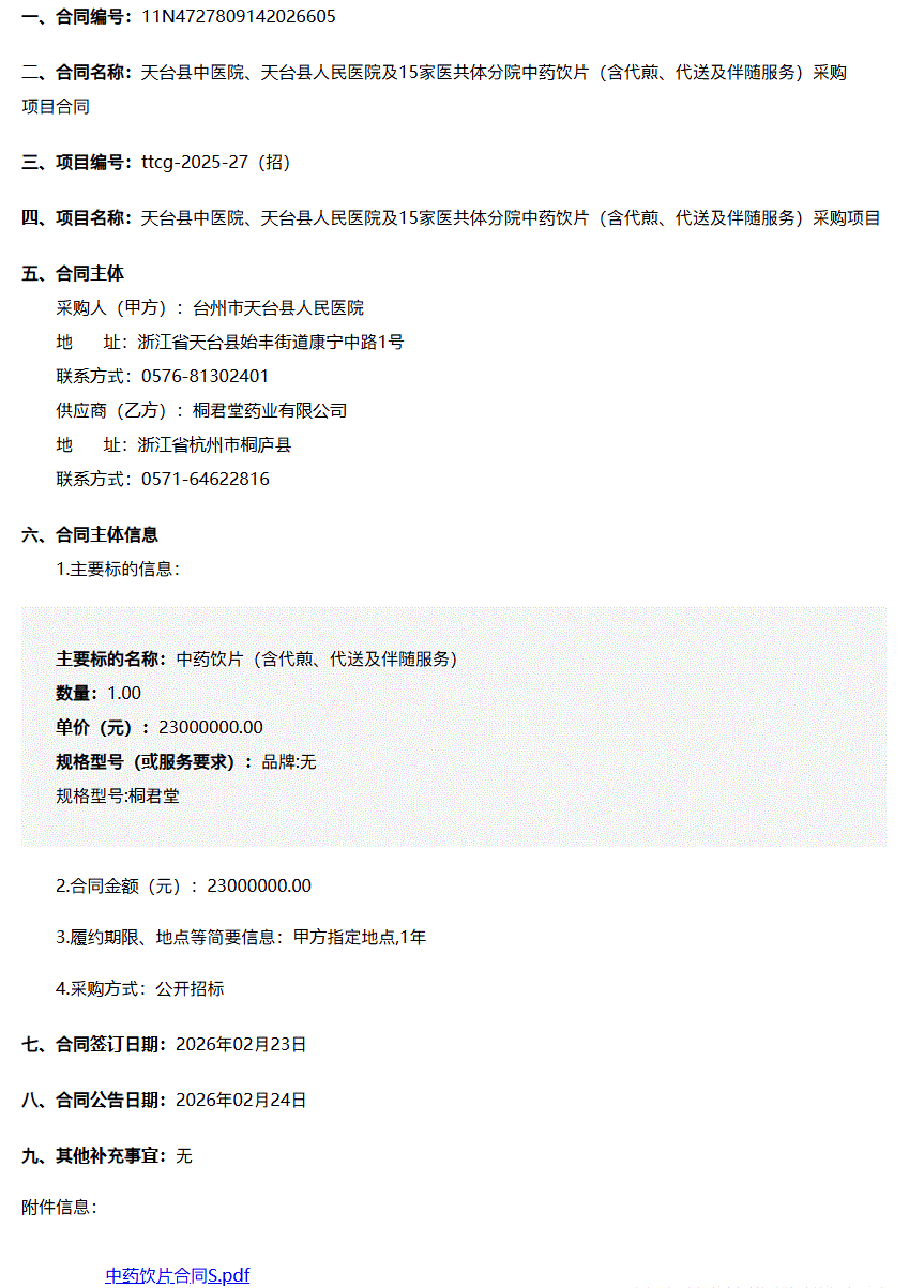 【台州市天台县人民医院】浙江省台州市天台县中医院、天台县人民医院及15家医共体分院中药饮片(含代煎、代送及伴随服务)采购项目合同公告