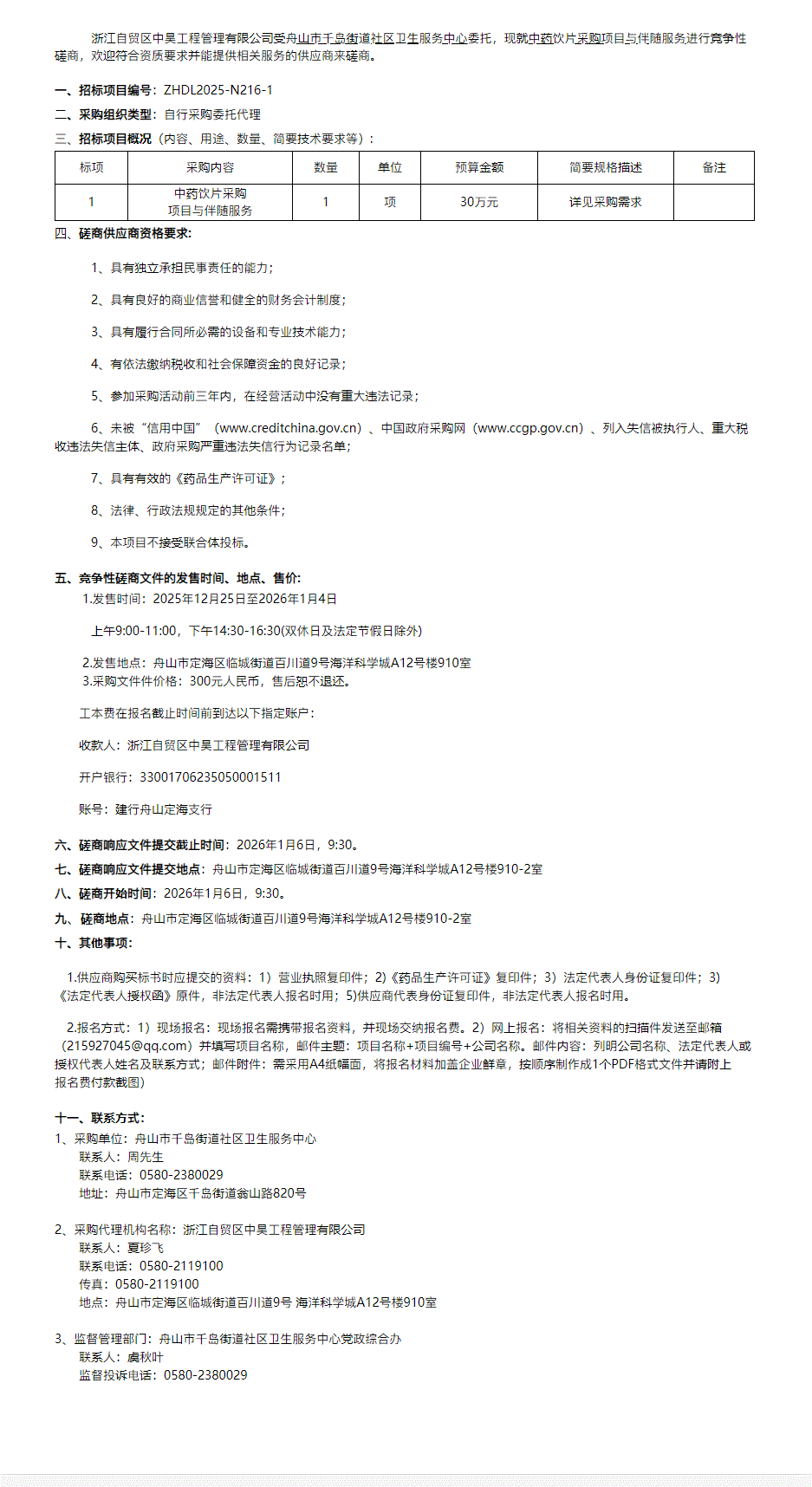 【舟山市千岛街道社区卫生服务中心】浙江省舟山市千岛街道社区卫生服务中心中药饮片采购项目与伴随服务采购公告(重新招标)