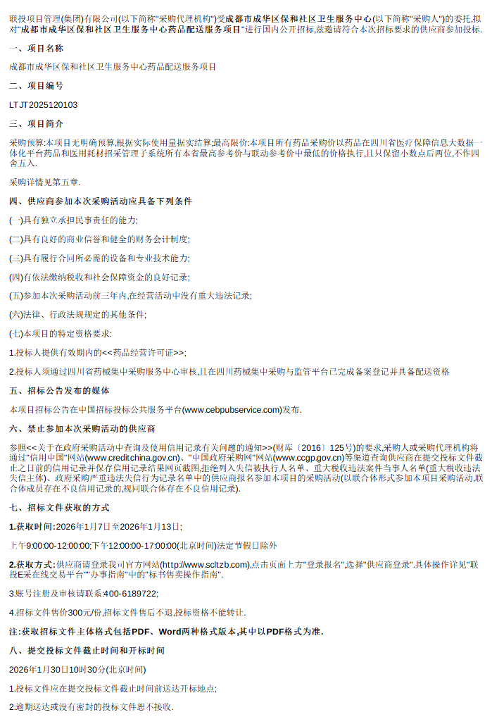【成都市成华区保和社区卫生服务中心】四川省成都市成华区保和社区卫生服务中心药品配送服务项目公开招标采购公告