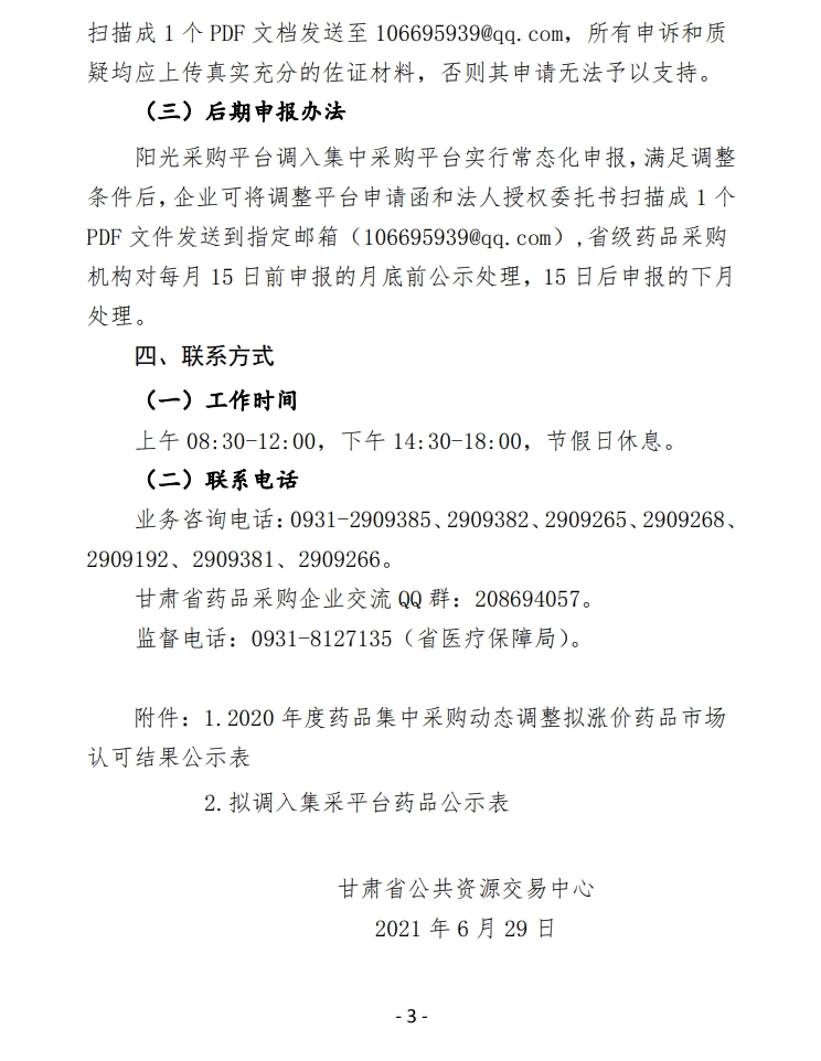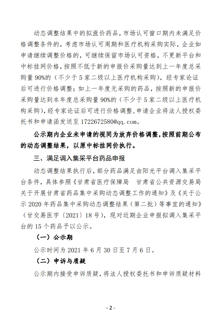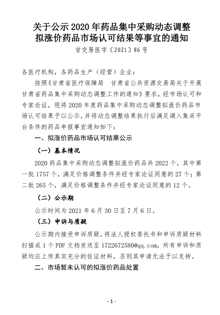 【甘肃】甘肃省关于公示2020年药品集中采购动态调整拟涨价药品市场认可结果等事宜的通知