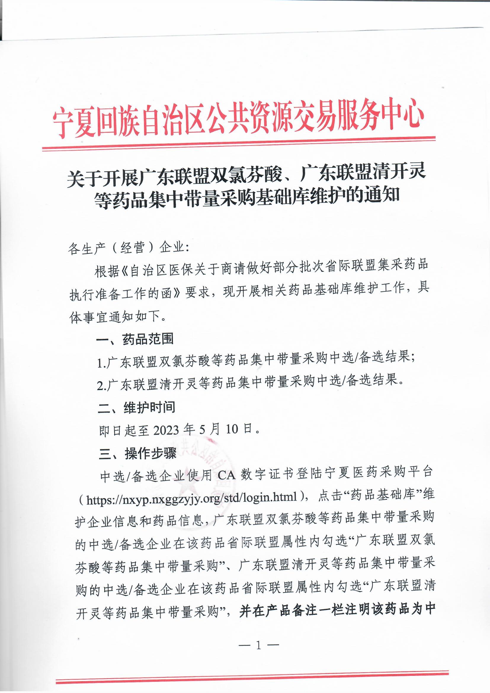 中选/备选企业使用CA数字证书登陆宁夏医药采购平台(https://nxyp.nxggzyjy.org/std/login.html),点击“药品基础库”维护企业信息和药品信息,广东联盟双氯芬酸等药品集中带量采购的中选/备选企业在该药品省际联盟属性内勾选"广东联盟双氯芬酸等药品集中带量采购”、广东联盟清开灵等药品集中带量采购的中选/备选企业在该药品省际联盟属性内勾选“广东联盟清开灵等药品集中带量采购",并在产品备注一栏注明该药品为中选或备选。已在宁夏医药采购平台维护药品基础库信息的中选/备选药品,点击“产品信息管理——产品信息变更”,补充维护省际联盟中选药品、省际联盟来源与产品备注等属性。具体操作见宁夏医药采购平台“首页—帮助文档——药品基础库操作手册”。