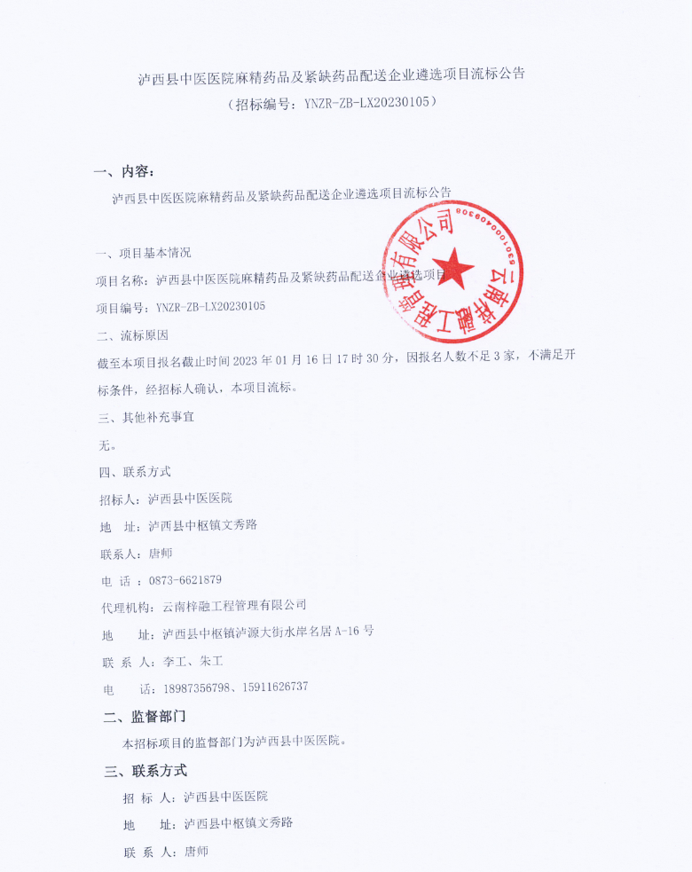 【红河哈尼族彝族自治州泸西县中医医院】云南省红河哈尼族彝族自治州泸西县中医医院麻精药品及紧缺药品配送企业遴选项目流标公告