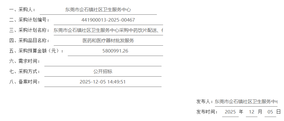 【东莞市企石镇社区卫生服务中心】广东省东莞市企石镇社区卫生服务中心采购中药饮片配送、代煎服务采购项目