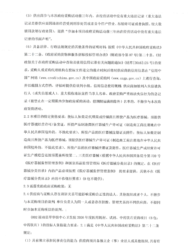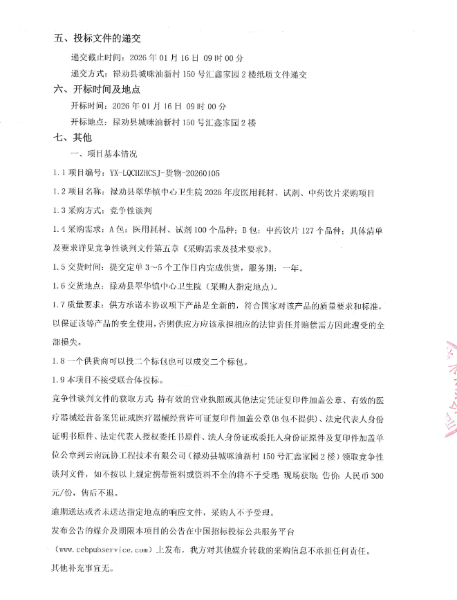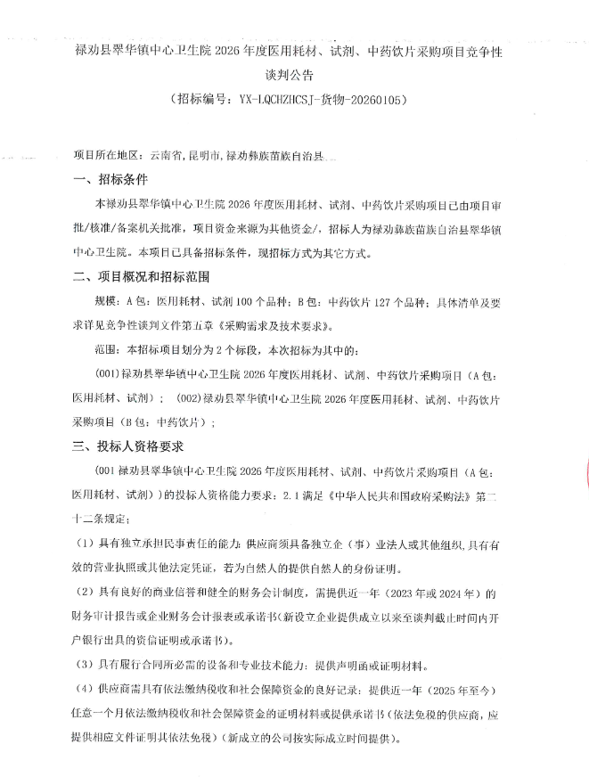 【昆明市禄劝彝族苗族自治县翠华镇卫生院】云南省昆明市禄劝彝族苗族自治县翠华镇中心卫生院2026年度医用耗材、试剂、中药饮片采购项目竞争性谈判公告