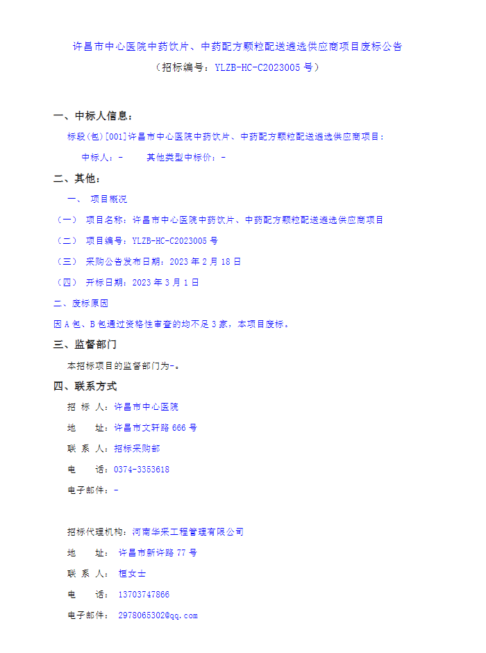 【许昌市中心医院】河南省许昌市中心医院中药饮片、中药配方颗粒配送遴选供应商项目废标公告