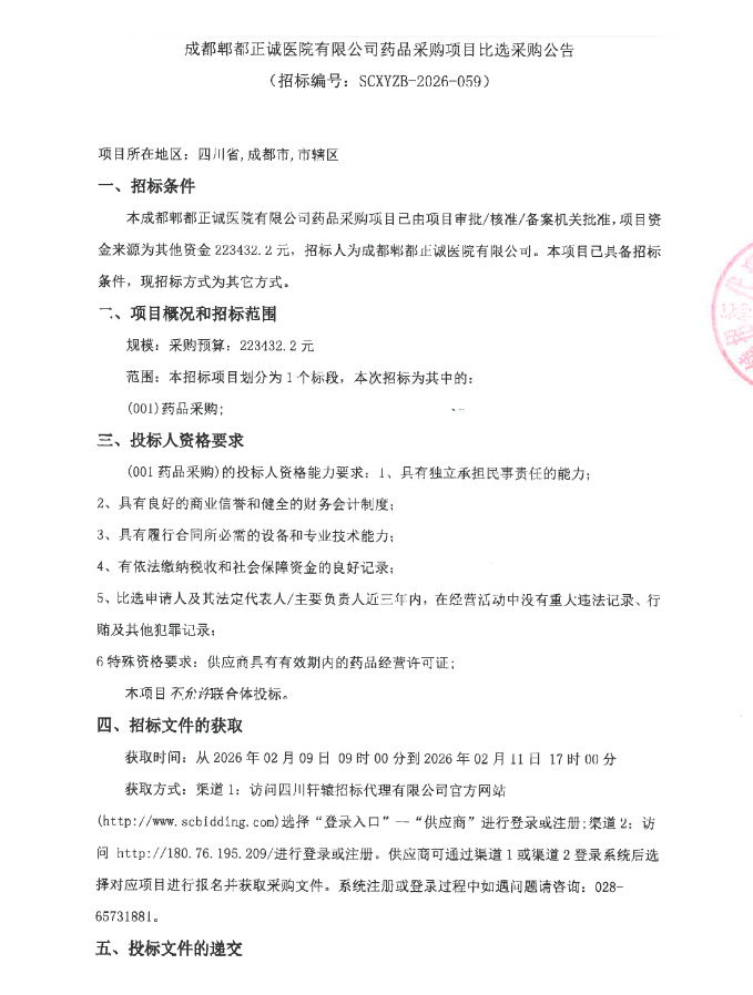 【成都郫都正诚医院】四川省成都郫都正诚医院有限公司药品采购项目比选采购公告