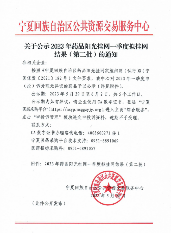 按照《宁夏回族自治区药品阳光挂网实施细则(试行)》(宁医保发〔2021〕182号)文件要求,我中心对2023年一季度申(投)诉处理无异议的药品予以公示(详见附件)。