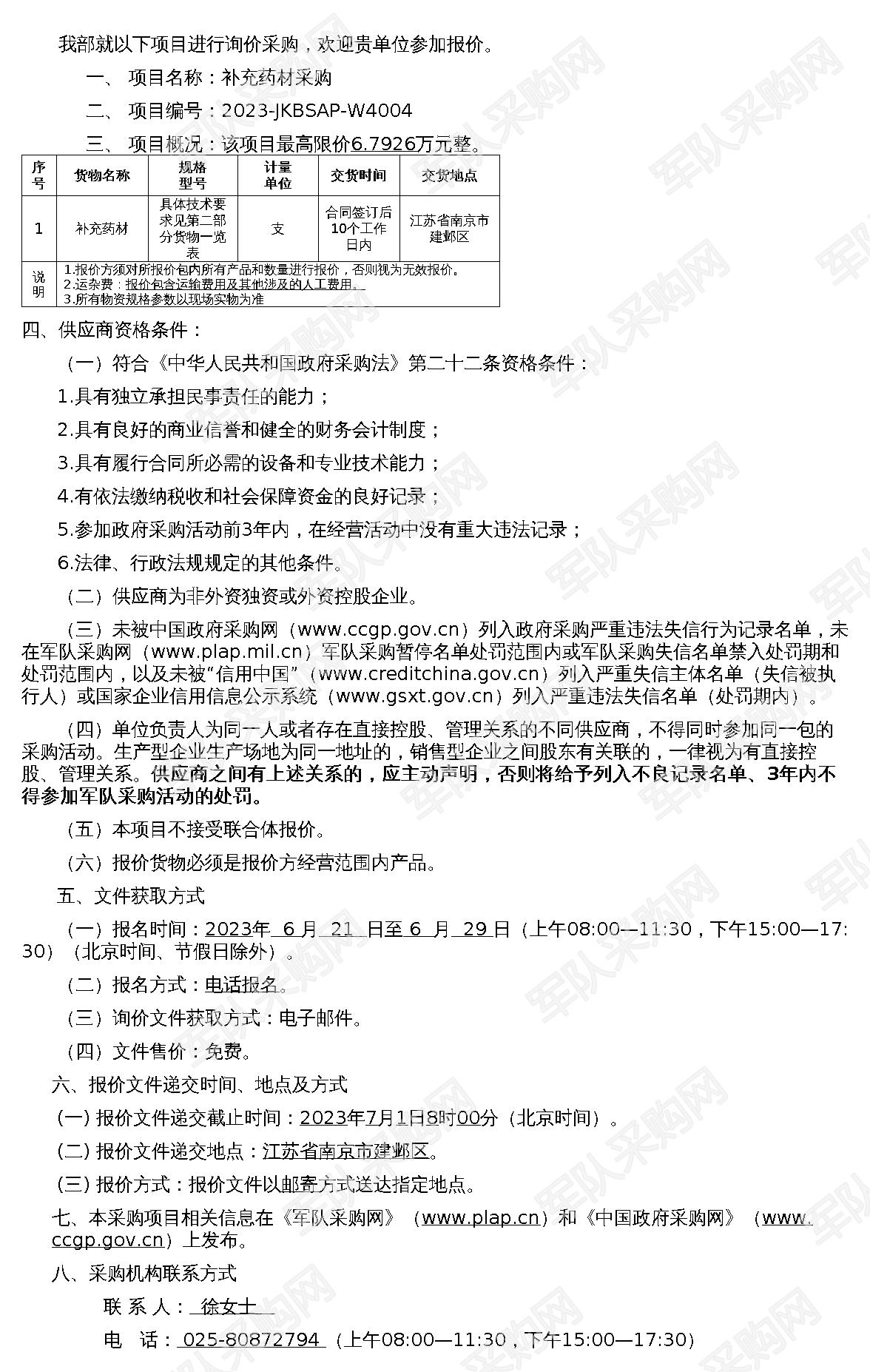 【军队采购】军队采购网补充药材采购询比价公告(2023-JKBSAP-W4004)