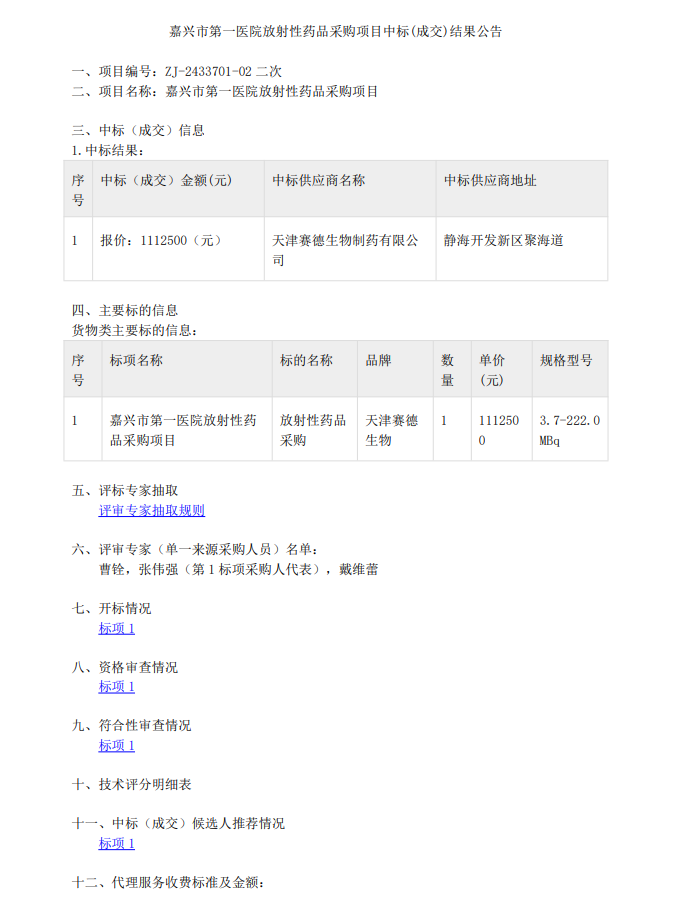 【嘉兴市第一医院】浙江省嘉兴市第一医院放射性药品II采购项目中标(成交)结果公告