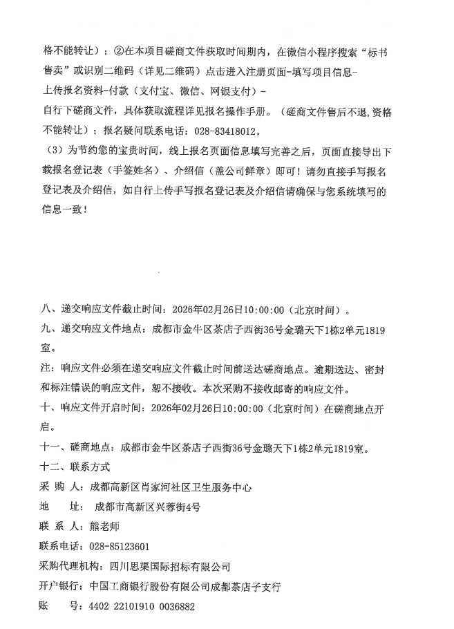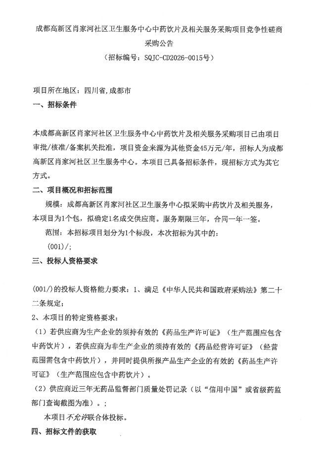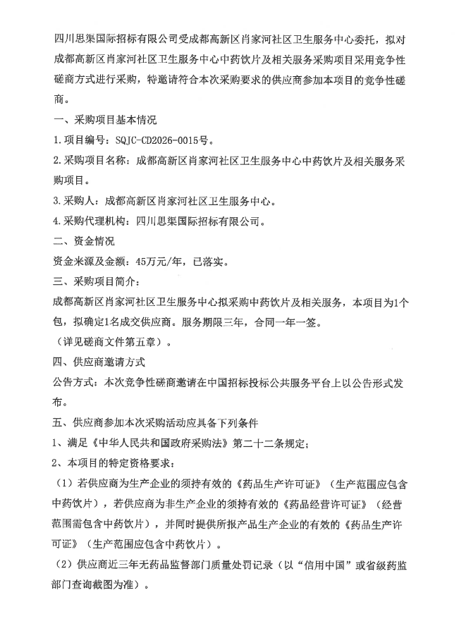 【成都高新区肖家河社区卫生服务中心】四川省成都高新区肖家河社区卫生服务中心中药饮片及相关服务采购项目竞争性磋商采购公告