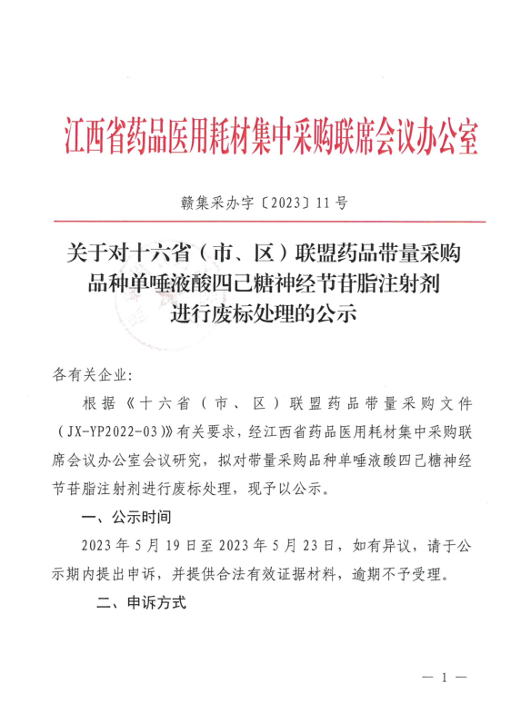 根据《十六省(市:区)联盟药品带量采购文件(JX-YP2022-03)》有关要求,经江西省药晶医用耗材集中采购联席会议办公宝会议研究,拟对带量采陶品种单唾流酸四已糖神经节苷腊连射剂进行发标处理,现子以公示.