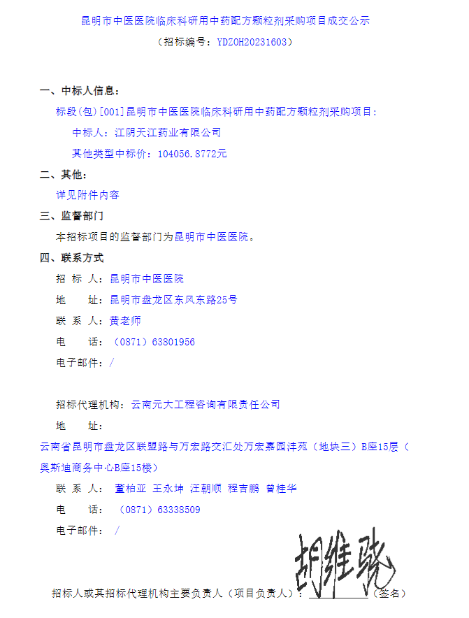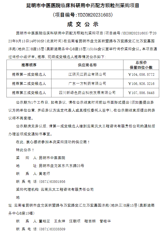 【昆明市中医医院】云南省昆明市中医医院临床科研用中药配方颗粒剂采购项目成交公示