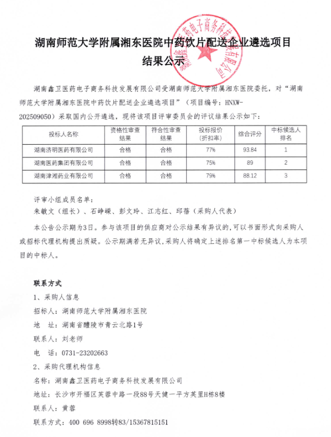 【湖南师范大学附属湘东医院】湖南师范大学附属湘东医院中药饮片配送企业遴选项目结果公示