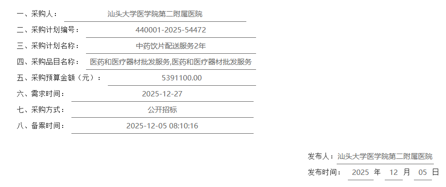 【汕头大学医学院第二附属医院】广东省汕头大学医学院第二附属医院中药饮片配送服务2年