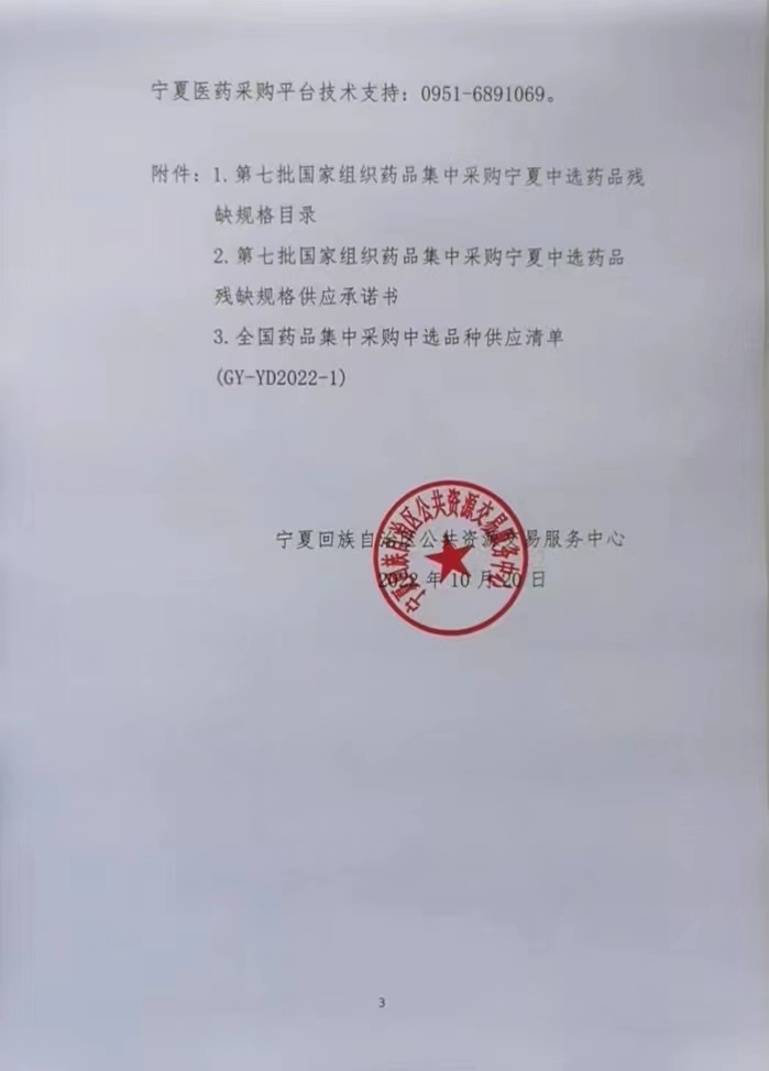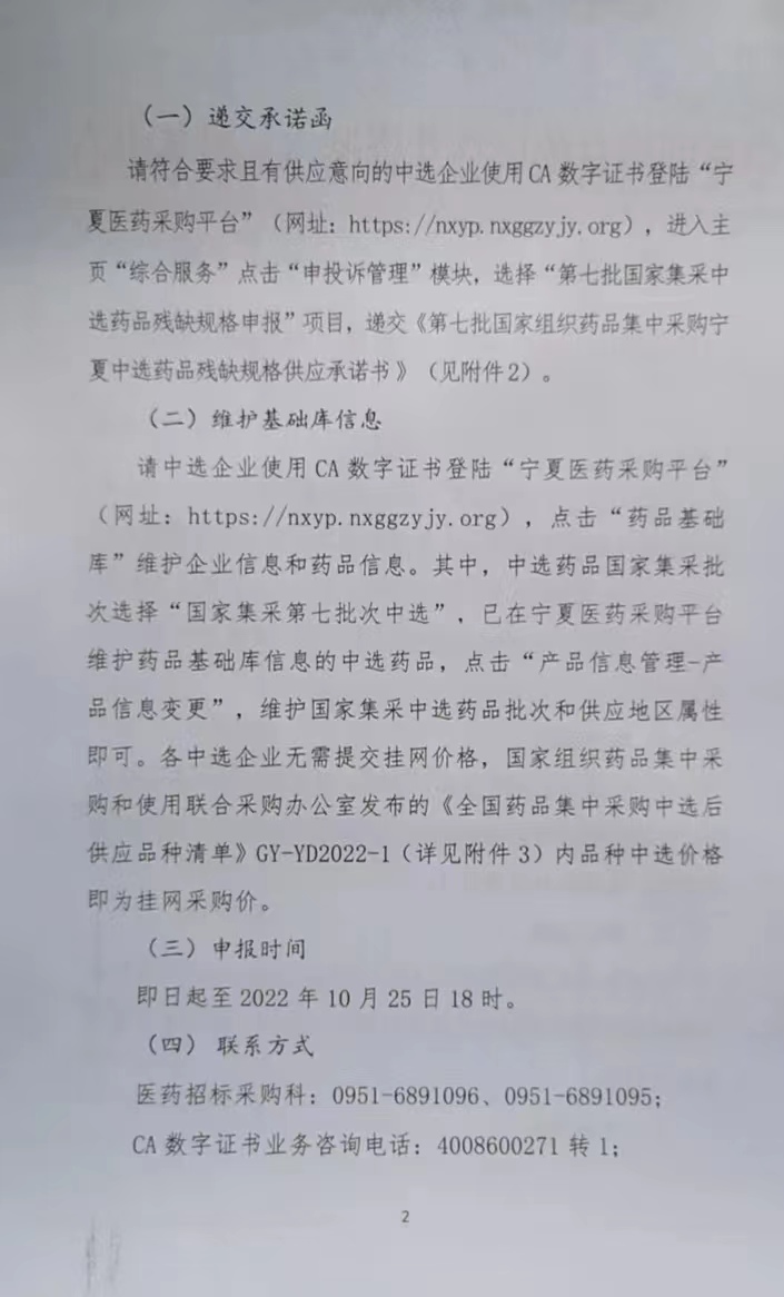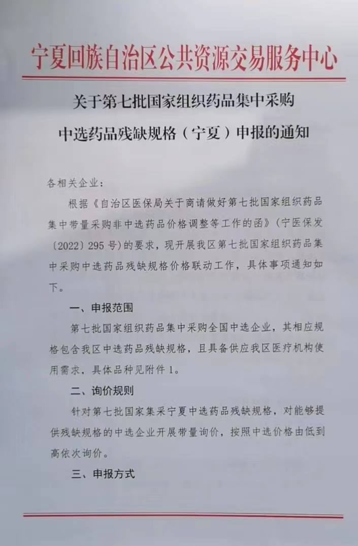 【宁夏】关于第七批国家组织药品集中采购中选药品残缺规格(宁夏)申报的通知