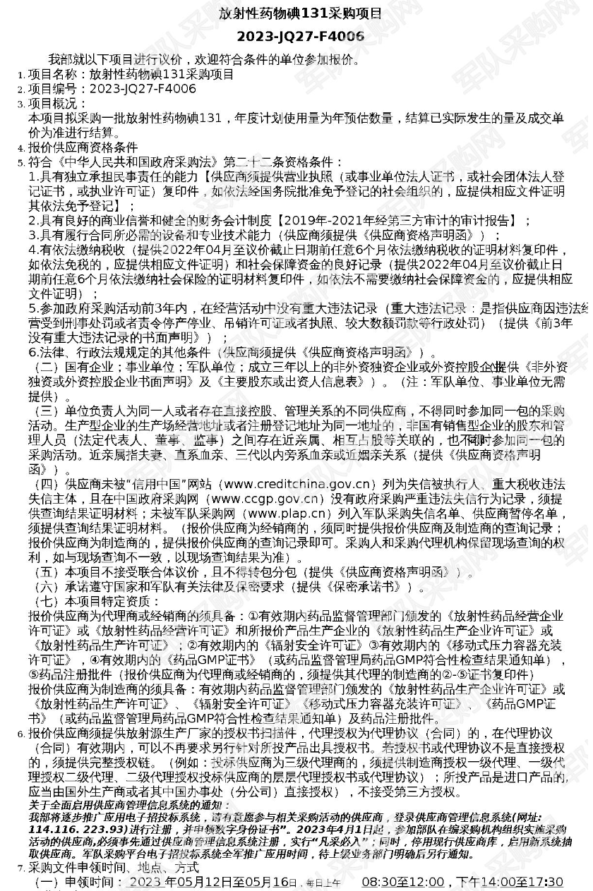 【军队采购】军队采购网放射性药物碘131采购项目+2023-JQ27-F4006