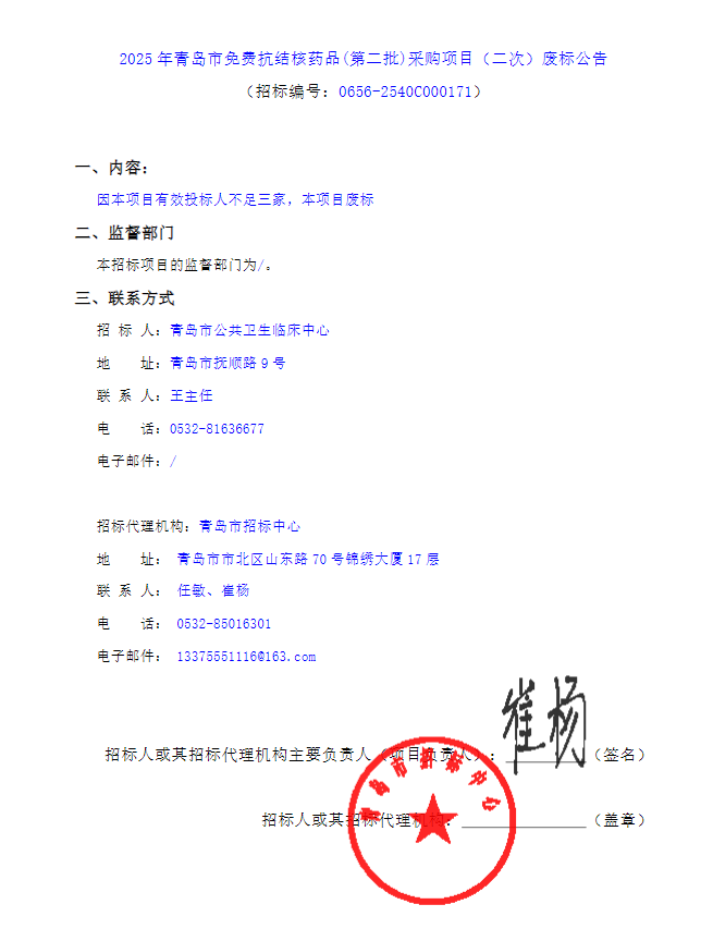 【青岛市公共卫生临床中心】山东省2025年青岛市免费抗结核药品(第二批)采购项目(二次)废标公告