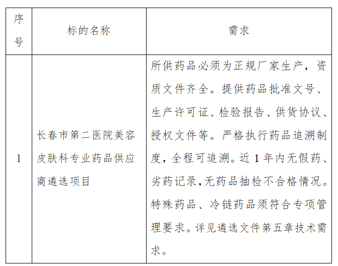 项目名称:长春市第二医院美容皮肤科专业药品供应商遴选项目项目编号:2026-2-9