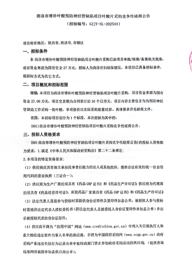 【商洛市妇幼保健院】陕西省商洛市增补叶酸预防神经管缺陷项目叶酸片采购竞争性磋商公告
