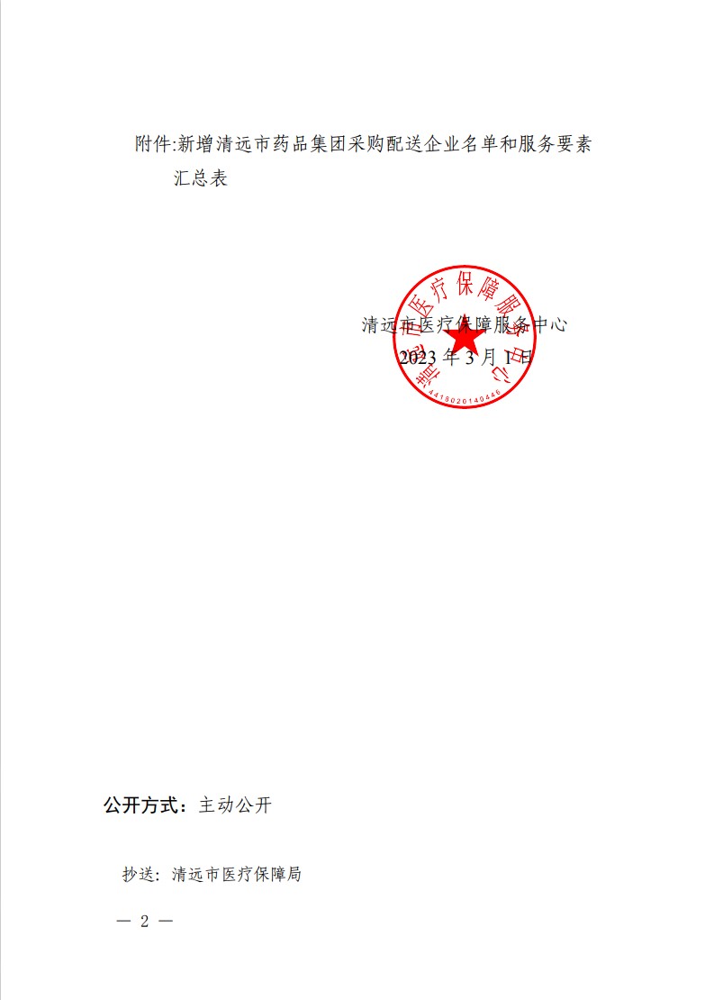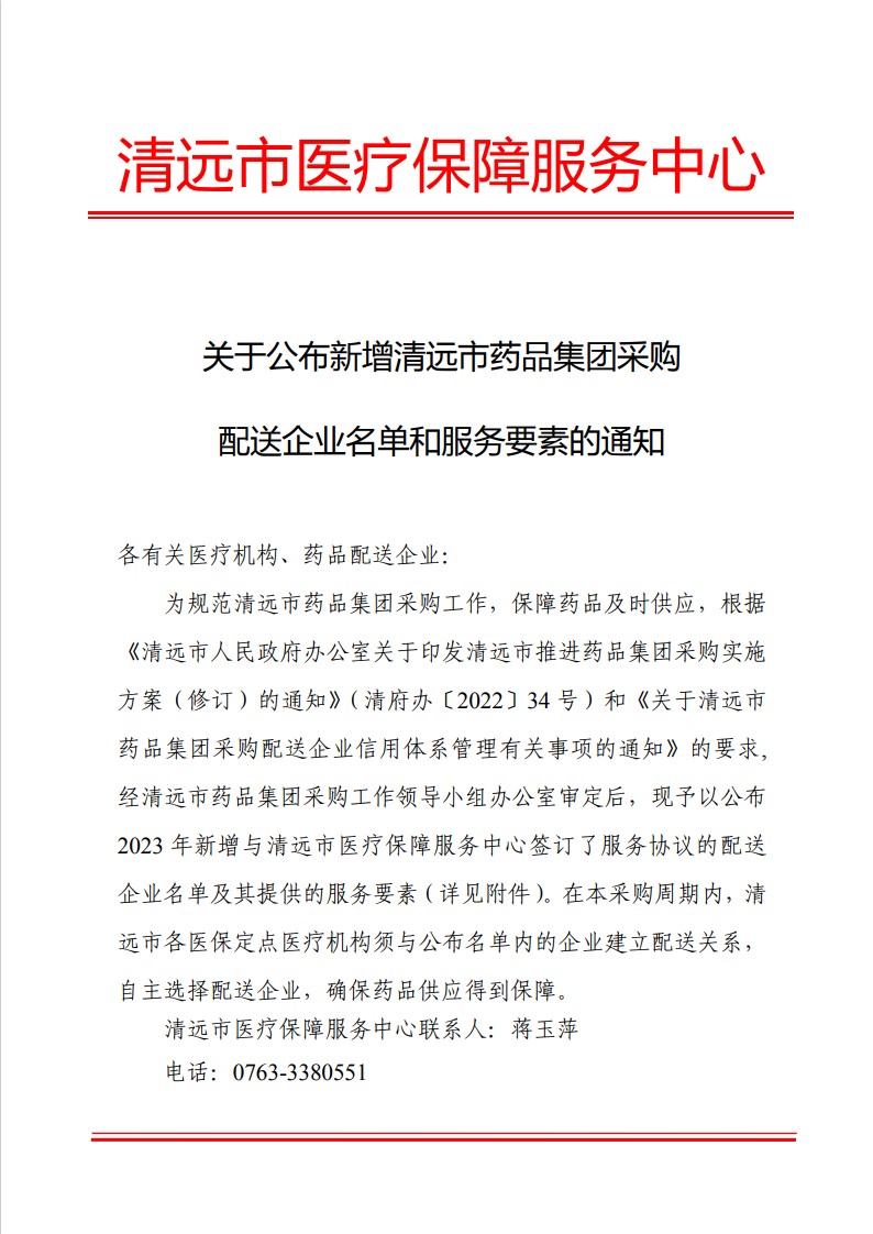 为规范清远市药品集团采购工作,保障药品及时供应,根据《清远市人民政府办公室关于印发清远市推进药品集团采购实施方案(修订)的通知》(清府办〔2022〕34号)和《关于清远市药品集团采购配送企业信用体系管理有关事项的通知》的要求,经清远市药品集团采购工作领导小组办公室审定后,现予以公布2023年新增与清远市医疗保障服务中心签订了服务协议的配送企业名单及其提供的服务要素(详见附件)。在本采购周期内,清远市各医保定点医疗机构须与公布名单内的企业建立配送关系,自主选择配送企业,确保药品供应得到保障。