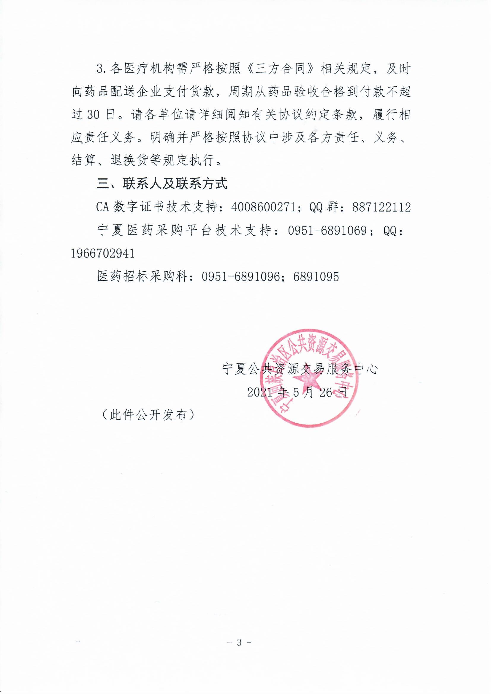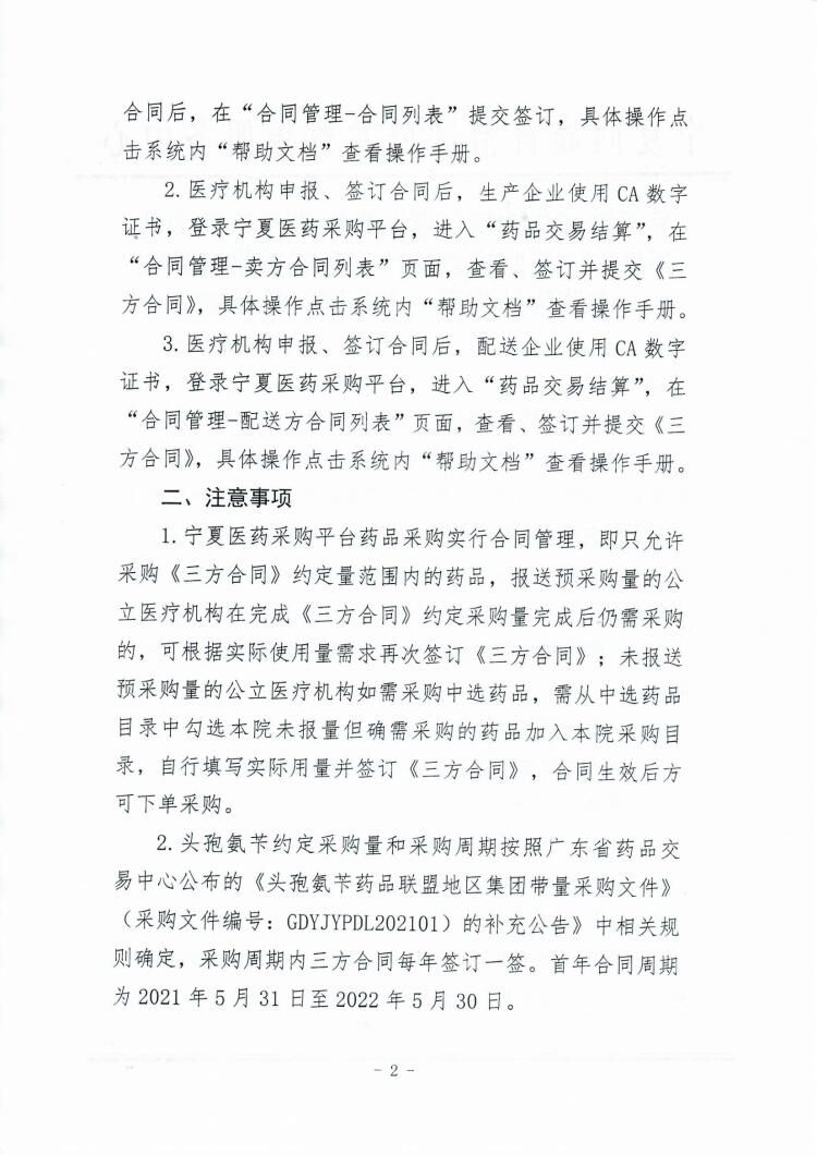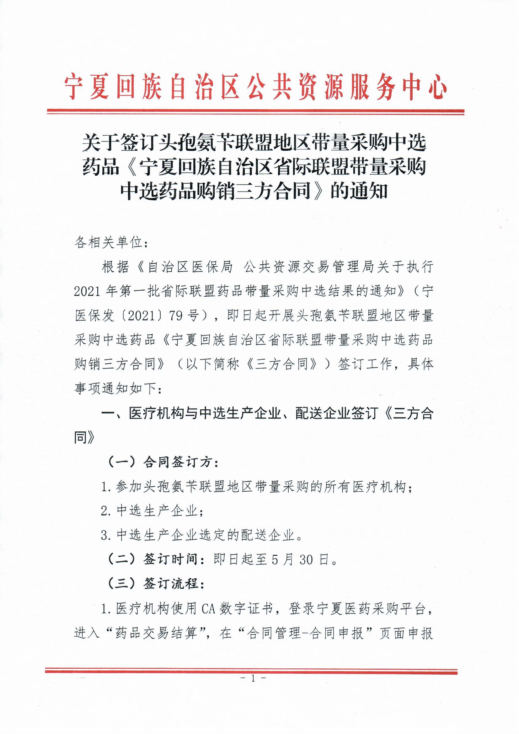 【宁夏】2021年宁夏自治区关于签订头孢氨苄联盟地区带量采购中选药品《宁夏回族自治区省际联盟带量采购中选药品购销第三方合同》的通知
