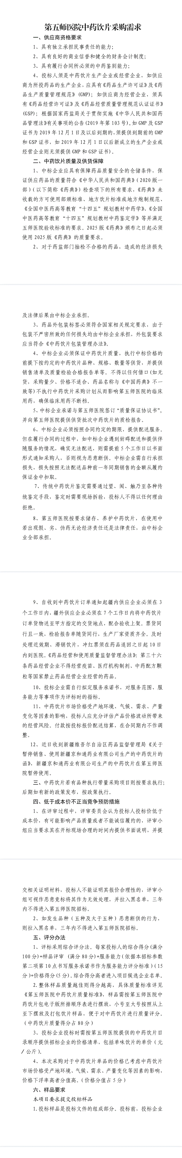 【新疆生产建设兵团第五师双河市总医院】新疆生产建设兵团第五师医院中药饮片采购需求(20250303)
