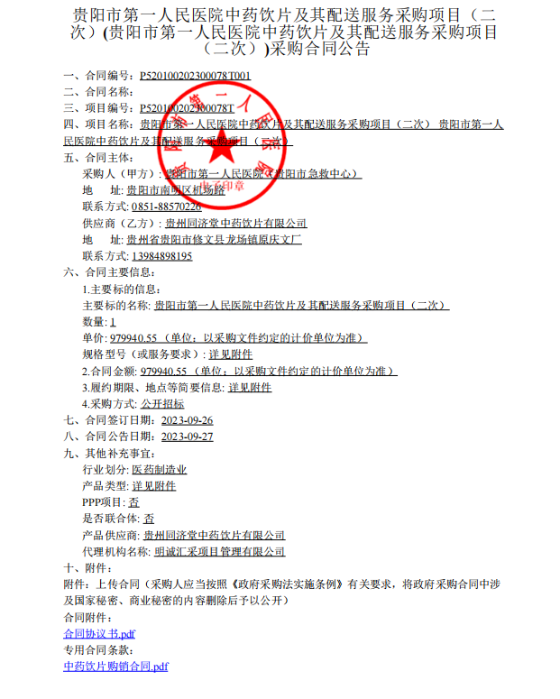【贵阳市第一人民医院】贵州省贵阳市第一人民医院中药饮片及其配送服务采购项目(二次)-贵阳市第一人民医院中药饮片及其配送服务采购项目(二次)合同公示