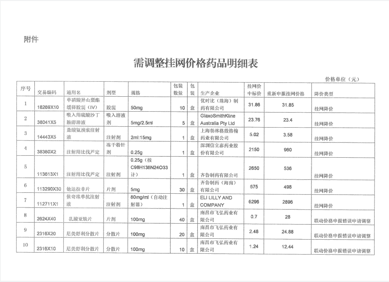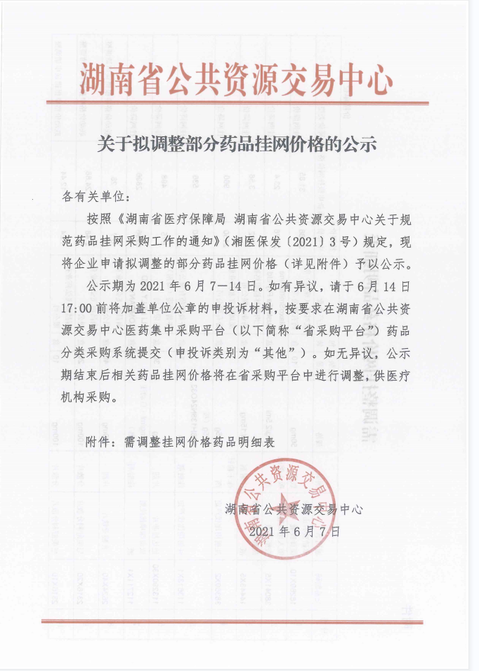 【湖南】2021年湖南省关于拟调整部分药品挂网价格的公示