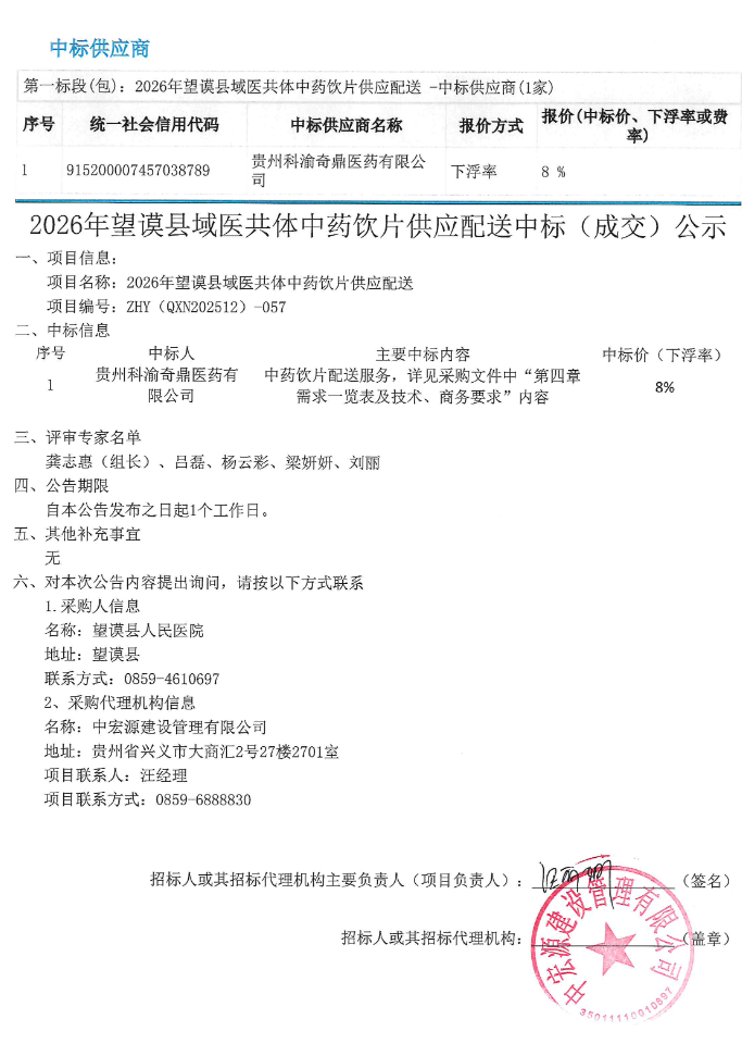 【黔西南布依苗族自治州望谟县人民医院】贵州省2026年望谟县域医共体中药饮片供应配送中标(成交)公示