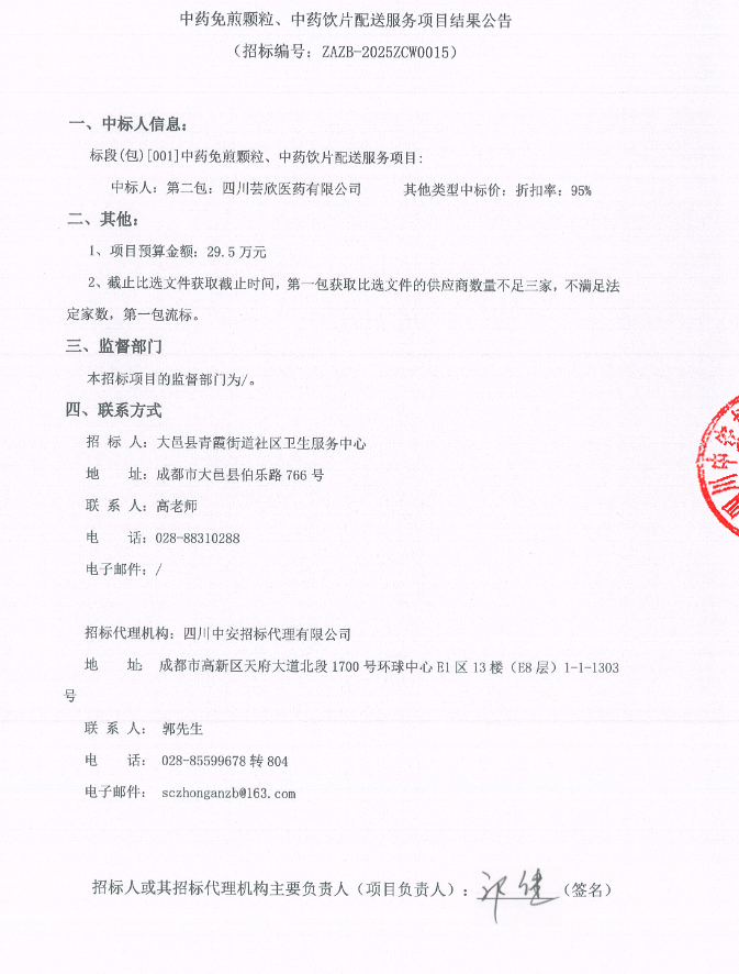【成都市大邑县青霞街道社区卫生服务中心】四川省成都市大邑县青霞街道社区卫生服务中心中药免煎颗粒、中药饮片配送服务项目结果公告