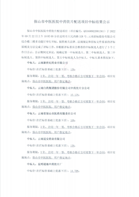 【云南省保山市中医医院】中药饮片配送项目中标结果公示