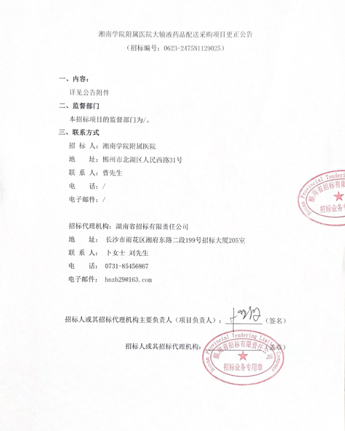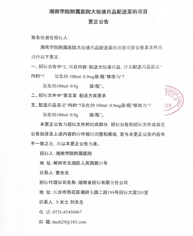 【郴州市湘南学院附属医院】湖南省郴州市湘南学院附属医院大输液药品配送采购项目更正公告