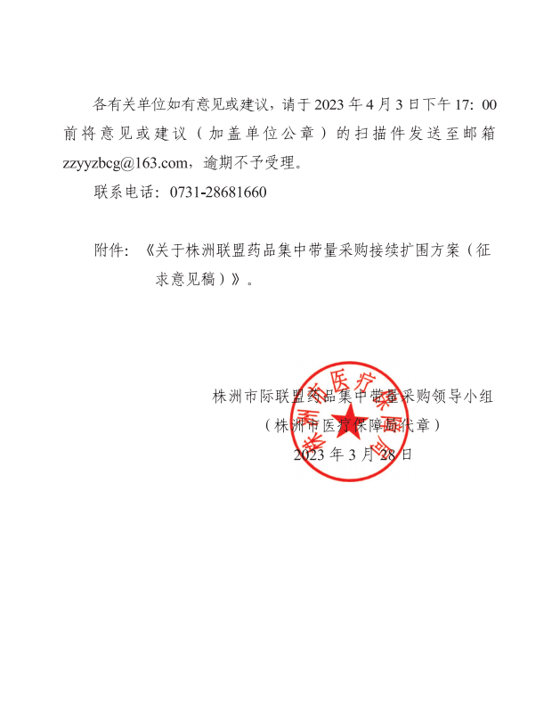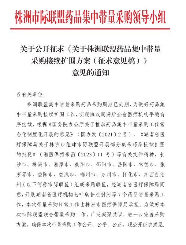 株洲联盟集中带量采购药品采购周期已到期,为做好药品集中带量采购接续扩围工作,实现协议期满后全省医疗机构平稳有序接续,根据《国务院办公厅关于推动药品集中带量采购工作常态化制度化开展的意见》(国办发〔2021〕2号)、《湖南省医疗保障局关于株洲市组建市际联盟开展部分集采药品接续扩围的批复》(湘医保招采函〔2023〕11 号)等有关文件精神,长沙市、株洲市、湘潭市、衡阳市、邵阳市、岳阳市、常德市、张家界市、益阳市、娄底市、郴州市、永州市、怀化市、湘西自治州(以下简称市际联盟)组成采购联盟,经湖南省医疗保障局同意,开展湖南省医疗机构七叶皂苷注射剂等7个药品带量采购工作,本次带量采购日常工作由株洲市医疗保障局承担。为做好本次市际联盟联合带量采购工作,广泛凝聚共识,进一步完善采购方案,确保本次带量采购工作公开、公平、公正,现公开征求意见各有关单位如有意见或建议,请于2023年4月3日下午17:00 前将意见或建议(加盖单位公章)的扫描件发送至邮箱zzyyzbcg@163.com,逾期不予受理。