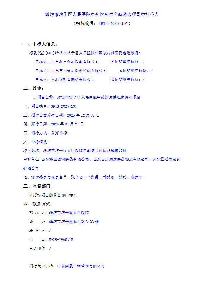 【潍坊市坊子区人民医院】山东省潍坊市坊子区人民医院中药饮片供应商遴选项目中标公告