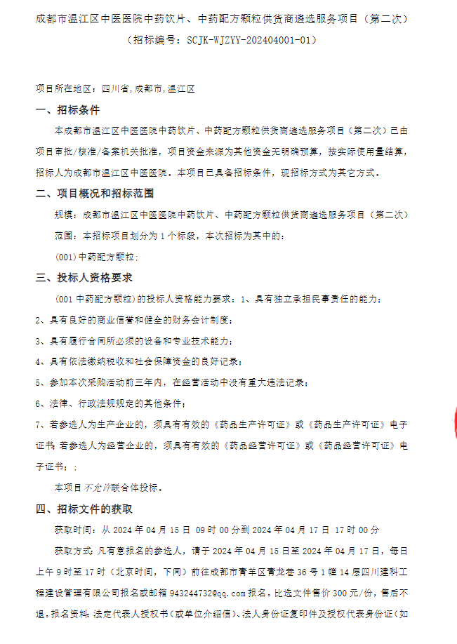 【成都市温江区中医医院】四川省成都市温江区中医医院中药饮片、中药配方颗粒供货商遴选服务项目(第二次)