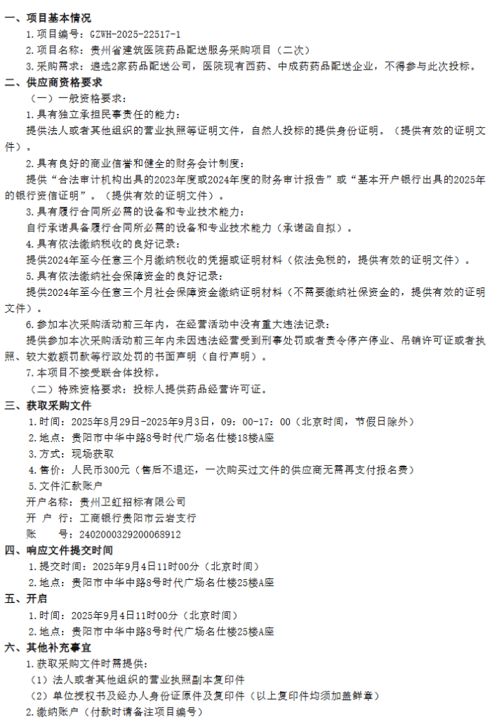 【贵州省建筑医院】贵州省建筑医院药品配送服务采购项目(二次)遴选公告