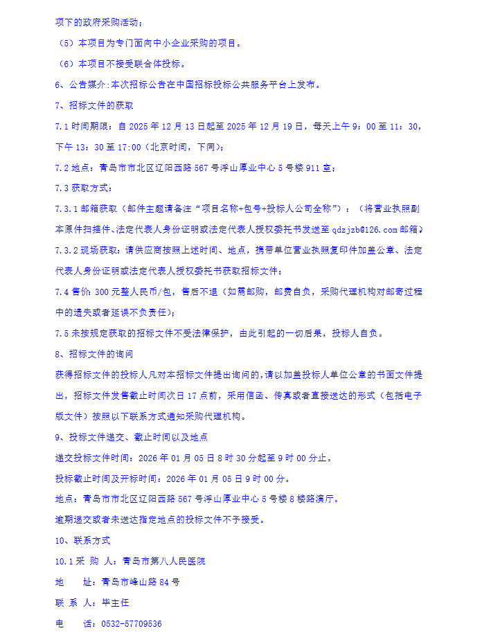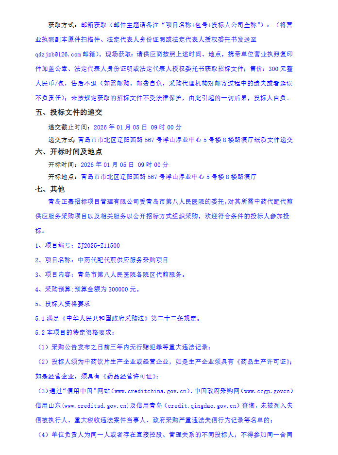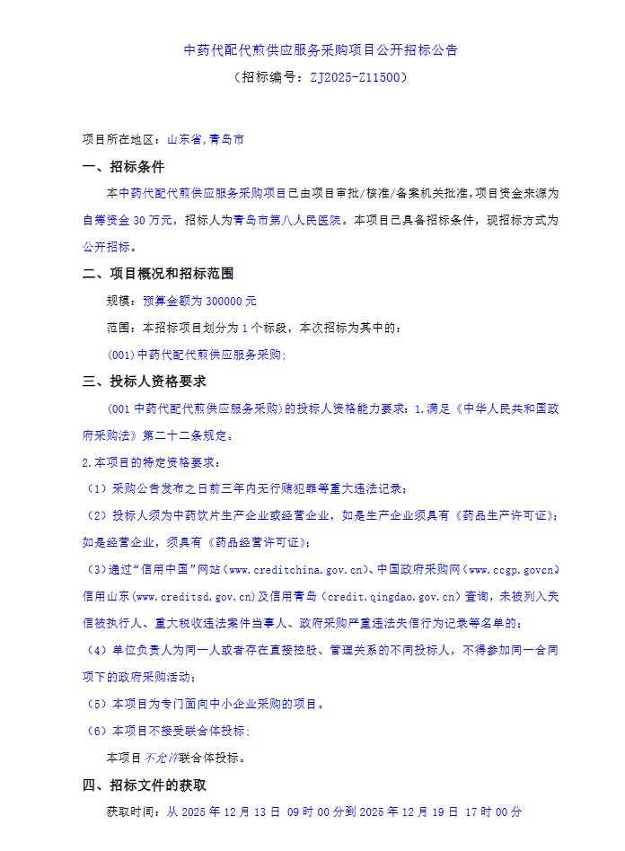 【青岛市第八人民医院】山东省青岛市第八人民医院中药代配代煎供应服务采购项目公开招标公告