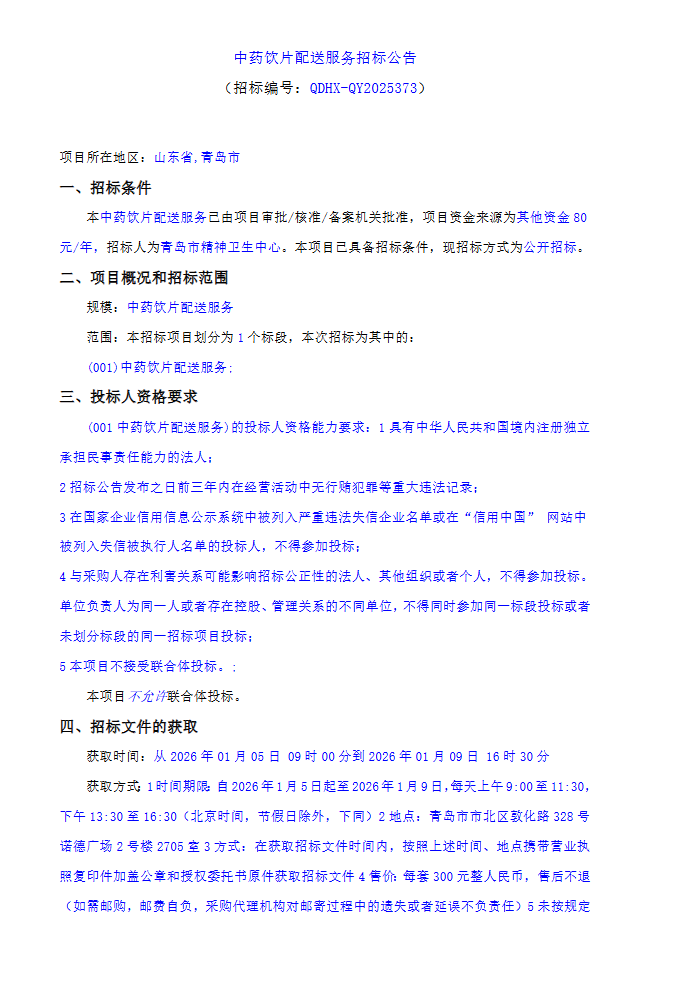 【青岛市精神卫生中心】山东省青岛市精神卫生中心中药饮片配送服务招标公告
