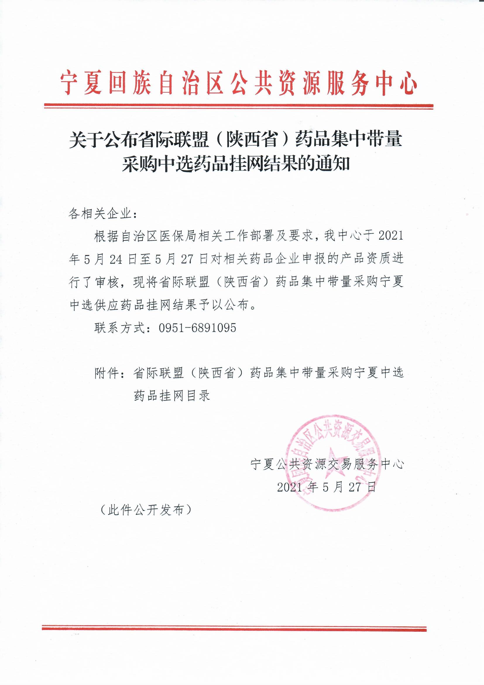 【宁夏】2021年宁夏自治区关于公布省际联盟(陕西省)药品集中带量采购中选药品挂网结果的通知