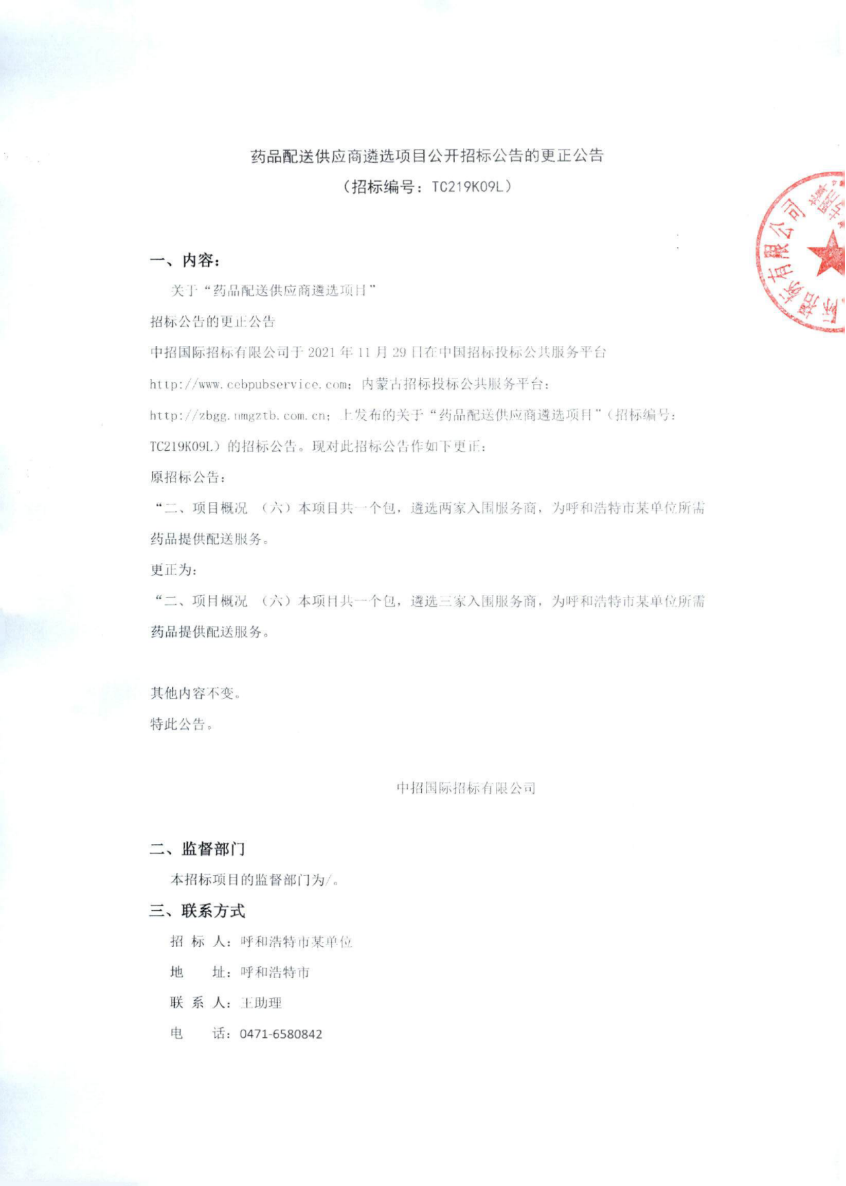 【呼和浩特】内蒙古自治区呼和浩特市药品配送供应商遴选项目公开招标公告的更正公告