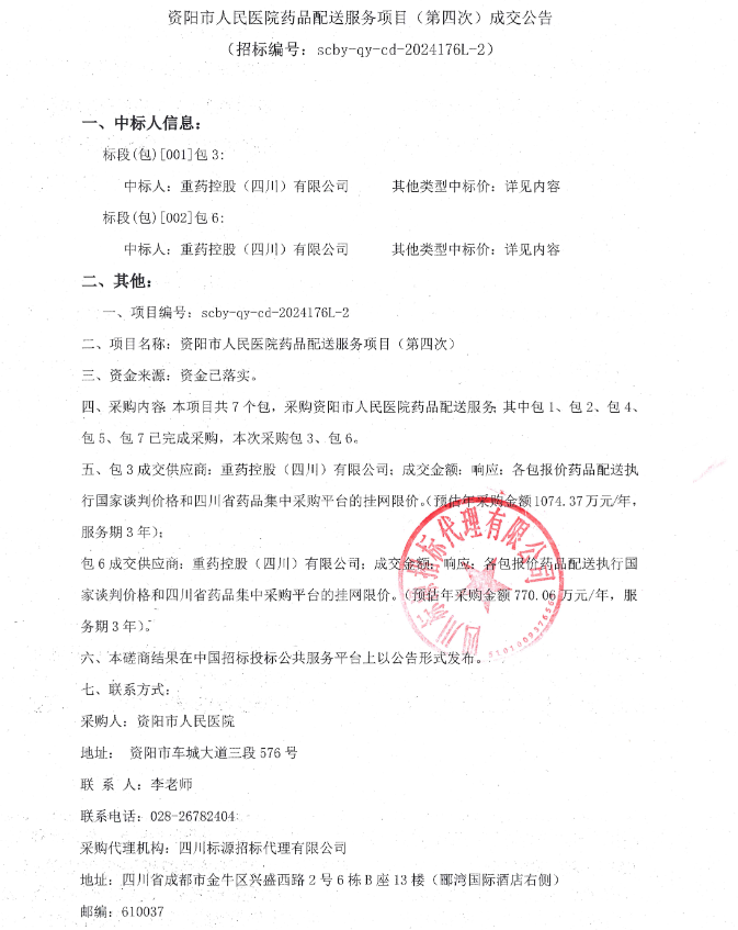 【资阳市人民医院】四川省资阳市人民医院药品配送服务项目(第四次)成交公告