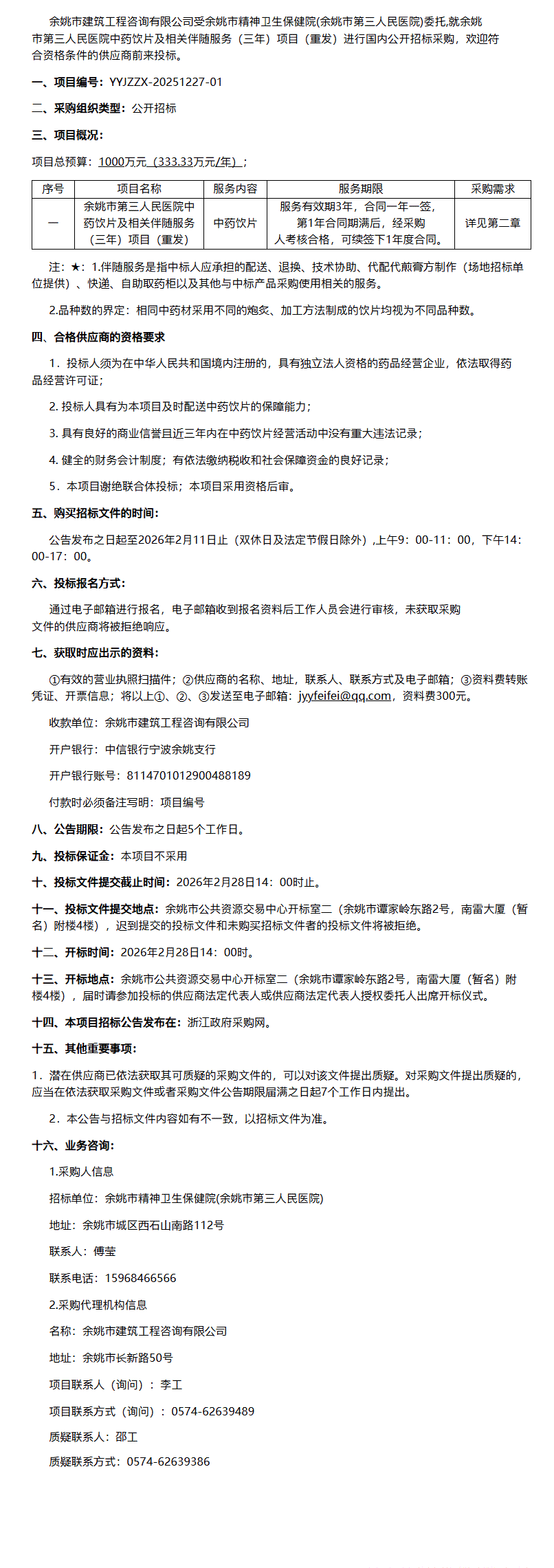 【宁波市余姚市第三人民医院】浙江省宁波市余姚市第三人民医院中药饮片及相关伴随服务(三年)项目(重发)公开招标公告