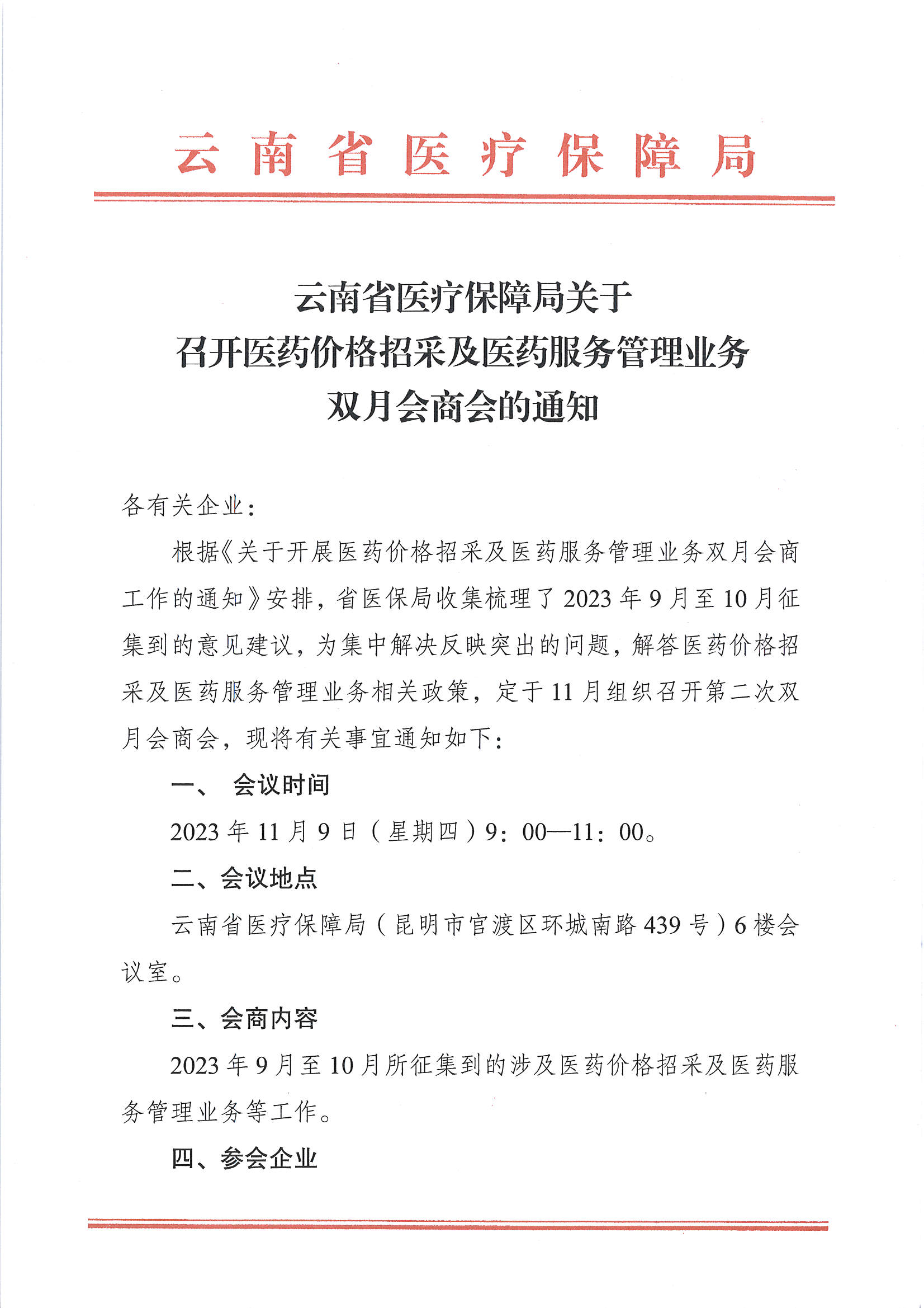 【云南】云南省医疗保障局关于召开医药价格招采及医药服务管理业务双月会商会的通知