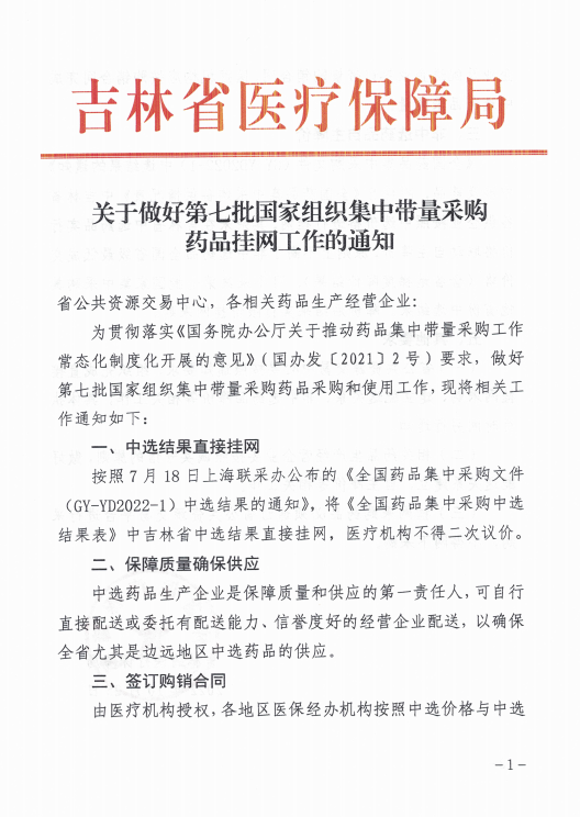 【吉林】关于做好第七批国家组织集中带量采购药品挂网工作的通知