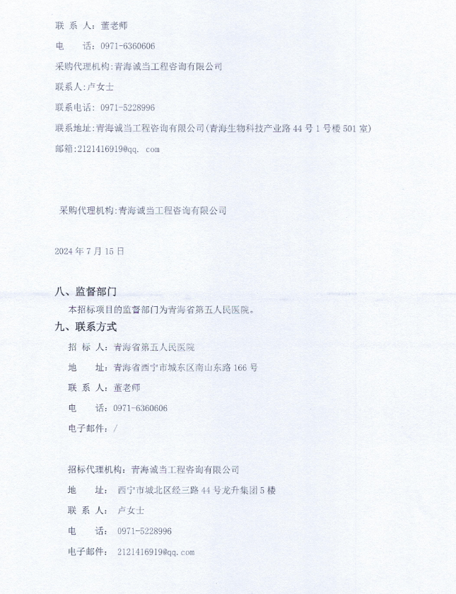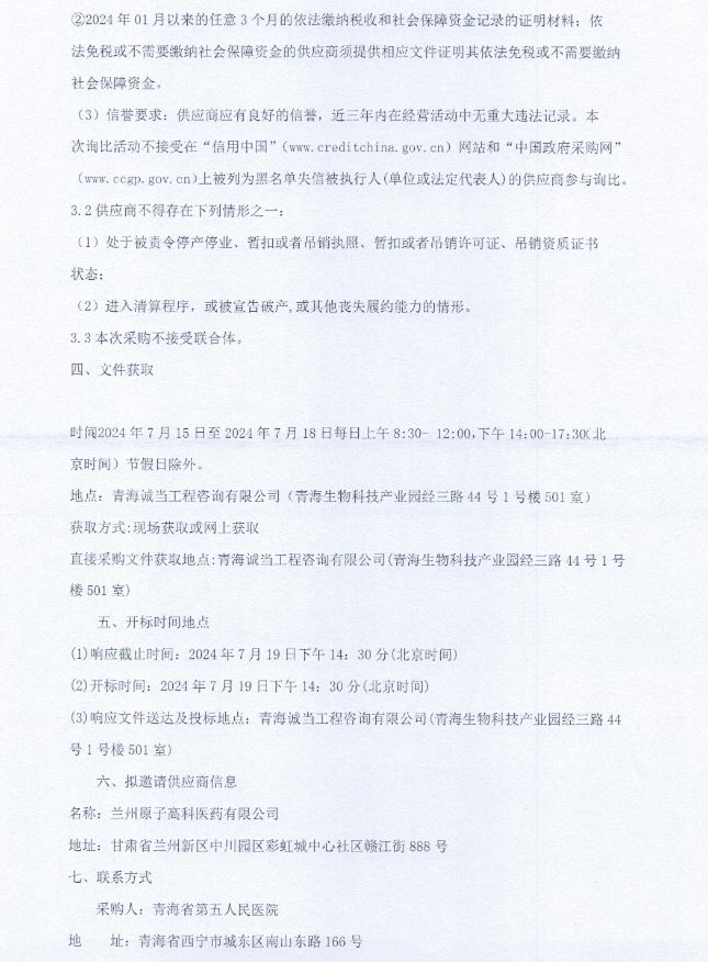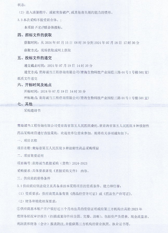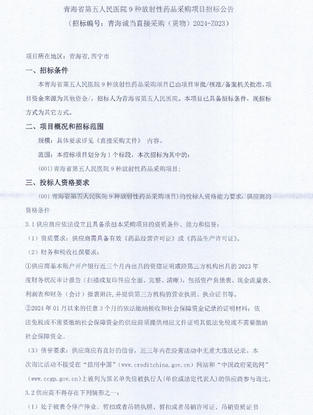 【青海省第五人民医院】青海省第五人民医院9种放射性药品采购项目招标公告(20240715)