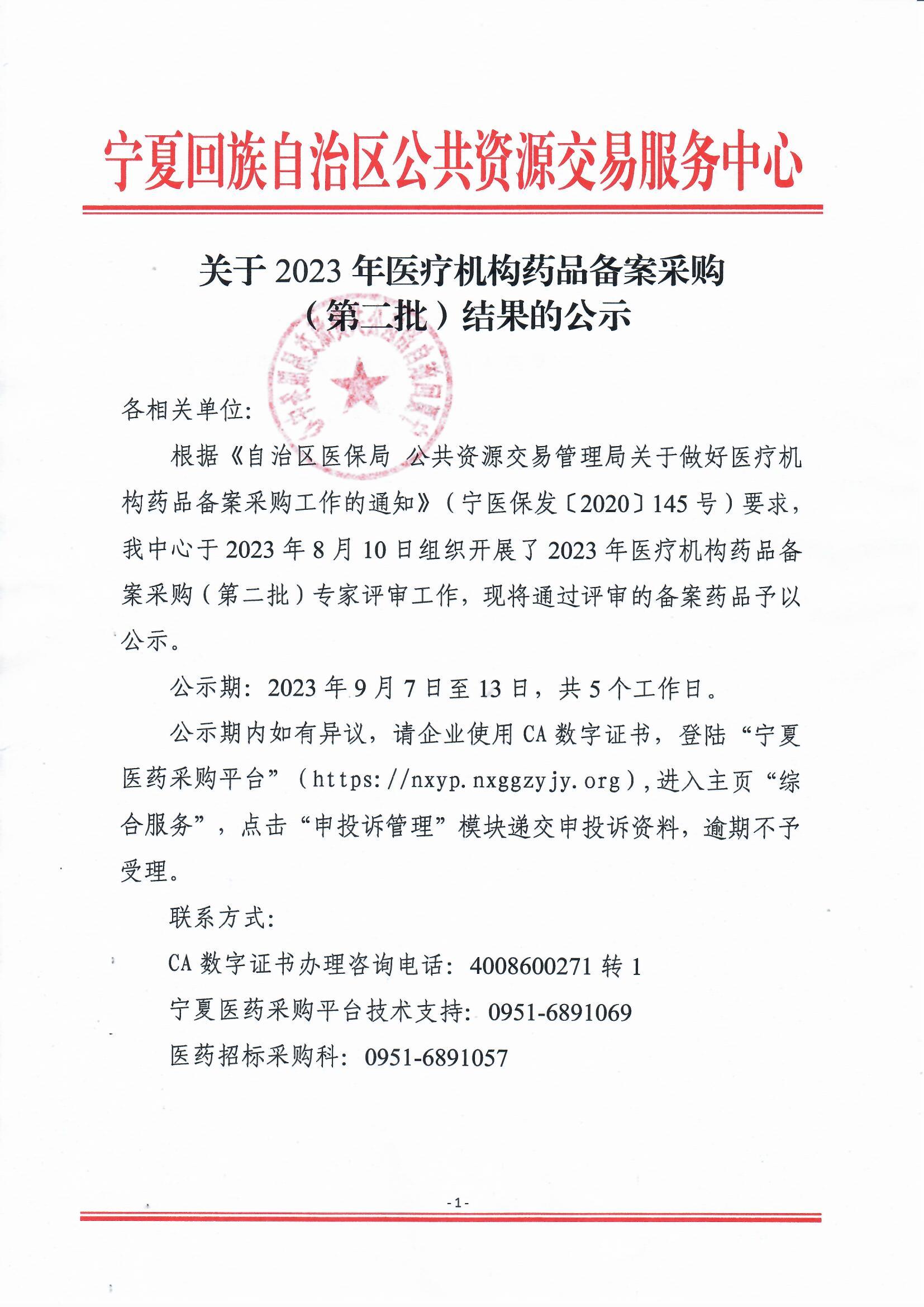 根据《自治区医保局公共资源交易管理局关于做好医疗机构药品备案采购工作的通知》(宁医保发〔2020〕145号)要求,我中心于2023年8月10日组织开展了2023年医疗机构药品备案采购(第二批)专家评审工作,现将通过评审的备案药品予以公示。