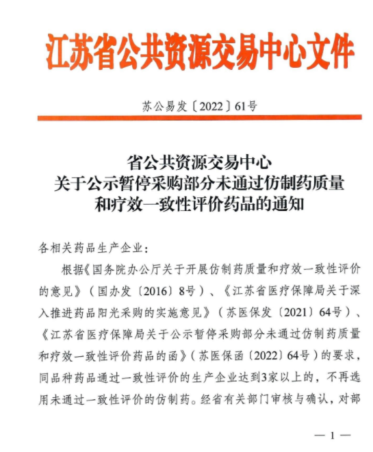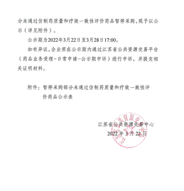 【江苏】江苏省公共资源交易中心关于公示暂停采购部分未通过仿制药质量和疗效一致性评价药品的通知(20220322)