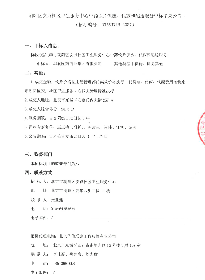 【北京市朝阳区安贞社区卫生服务中心】北京市朝阳区安贞社区卫生服务中心中药饮片供应、代煎和配送服务中标结果公告