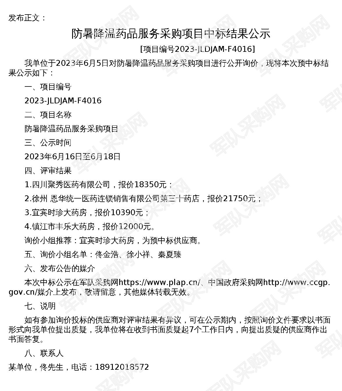 【军队采购】军队采购网防暑降温药品服务采购项目中标结果公示〔2023-JLDJAM-F4016〕