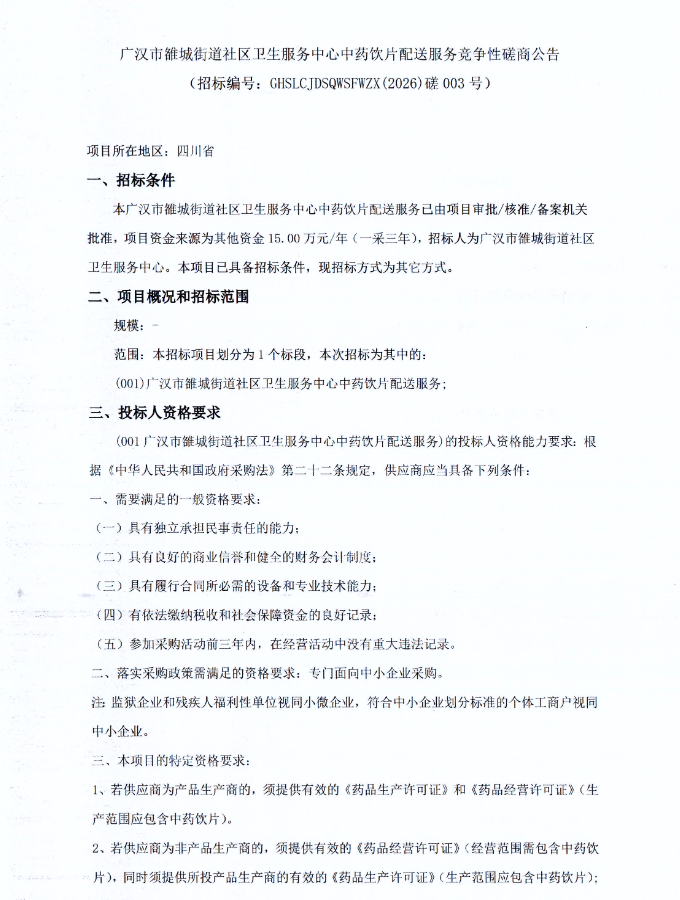 【德阳市广汉市雒城街道社区卫生服务中心】四川省德阳市广汉市雒城街道社区卫生服务中心中药饮片配送服务竞争性磋商公告
